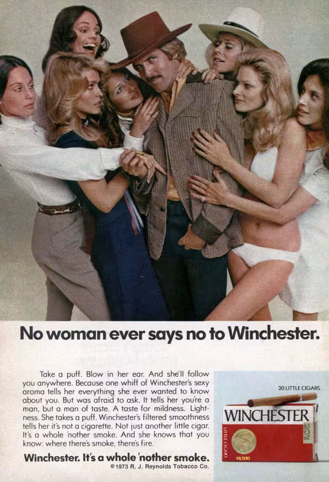 Winchester Cigarettes dropped this ridiculous ad in 1973. Clearly they’re going for the classic sex appeal approach here. But, who told them getting cigarette smoke blown in your face was desirable?