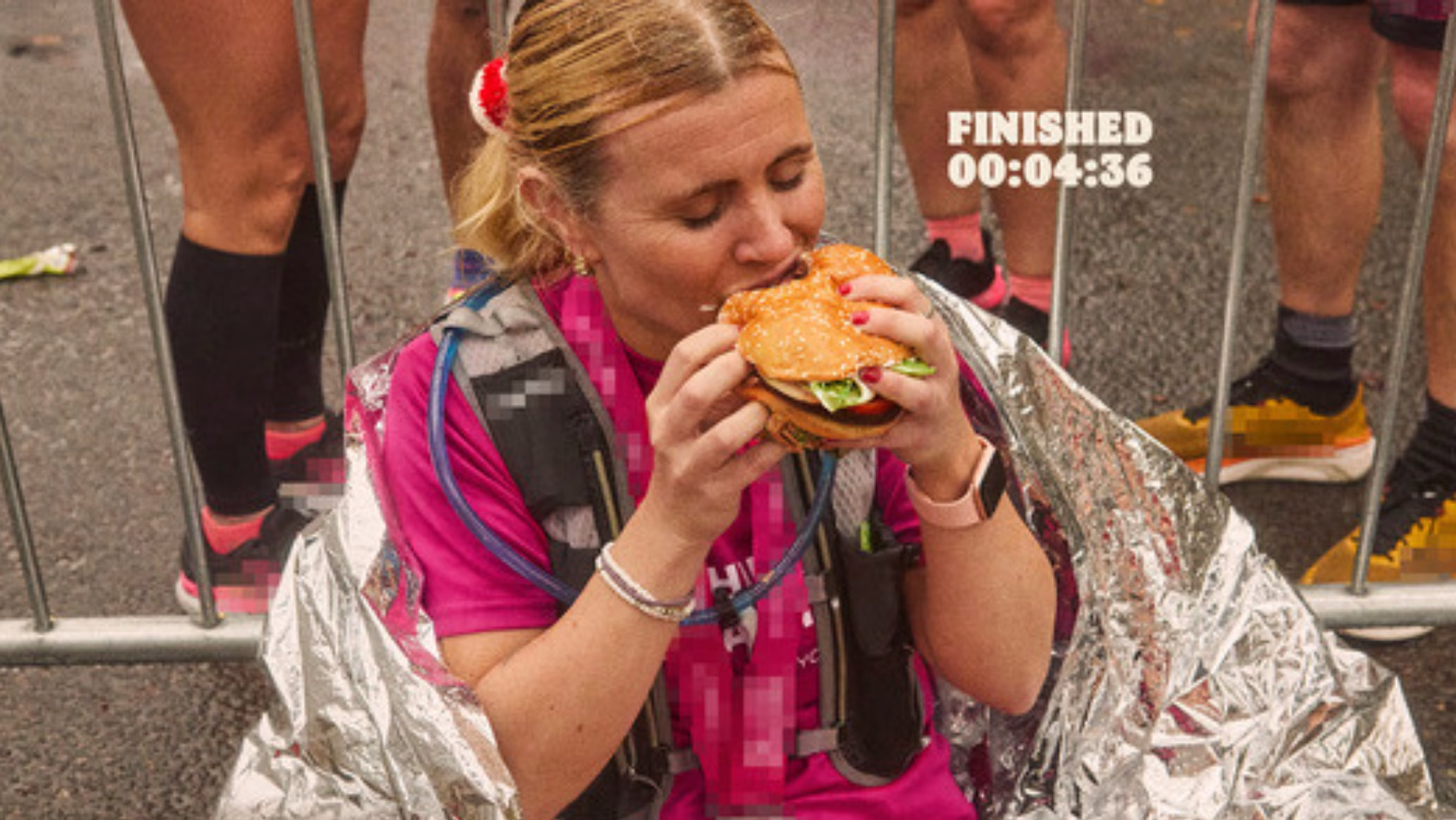 But instead of polished athletes, they went for real marathon runners, with their medals still on, wrapped in foil blankets, candidly hungry and relieved.
