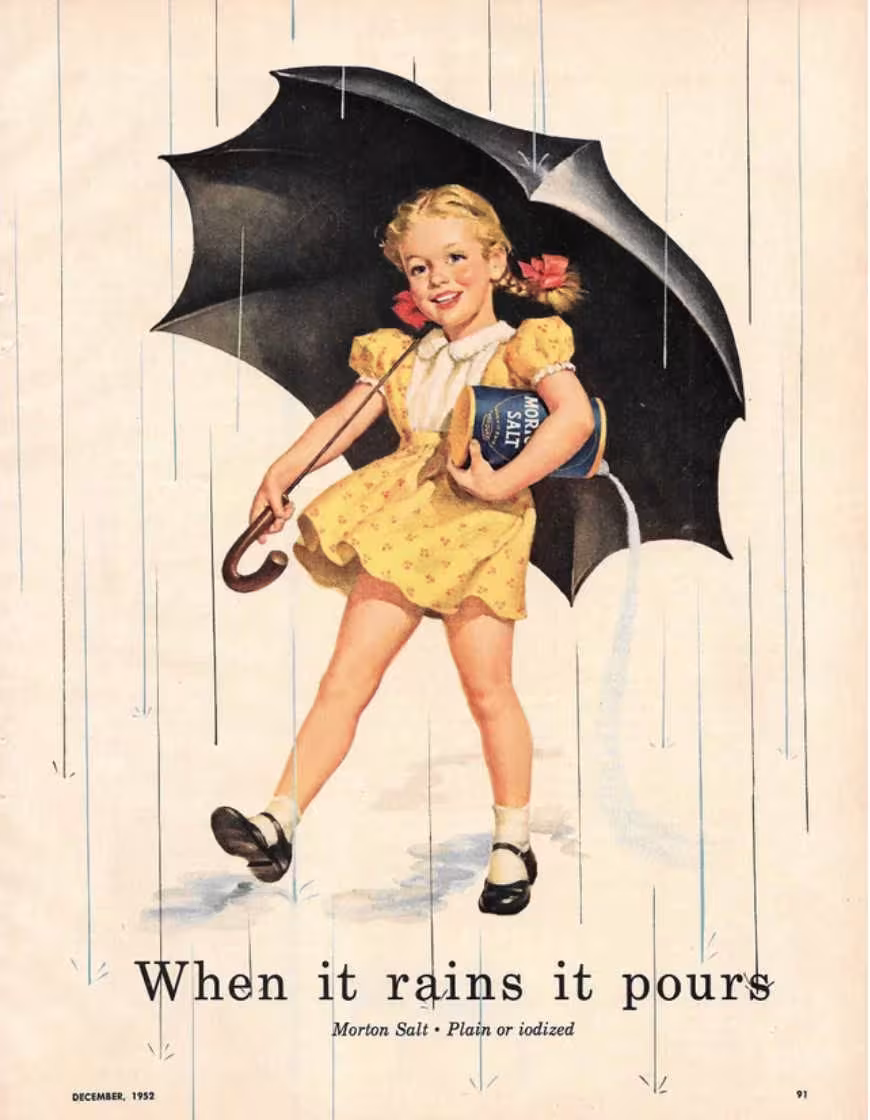 The Morton Salt Girl is one of the most iconic logos in existence. She was initially used in a Morton ad campaign in 1914, but this ad is from 1952.