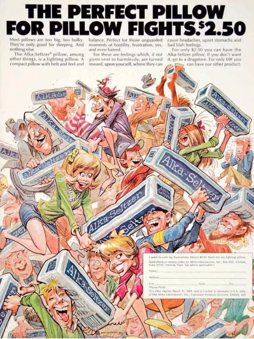 This chaotic, 1968 ad is promoting the Alka-Seltzer pillow. You know, for those times you want to lay the smackdown on someone without gettin’ into real trouble.