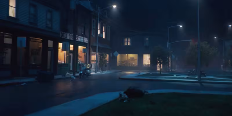 In this particular ad, the opening shots show an empty town, empty streets, no one around. Lights in the buildings are on, but there is no movement. Eerie music plays in the background. It actually feels like the opening to a horror movie.