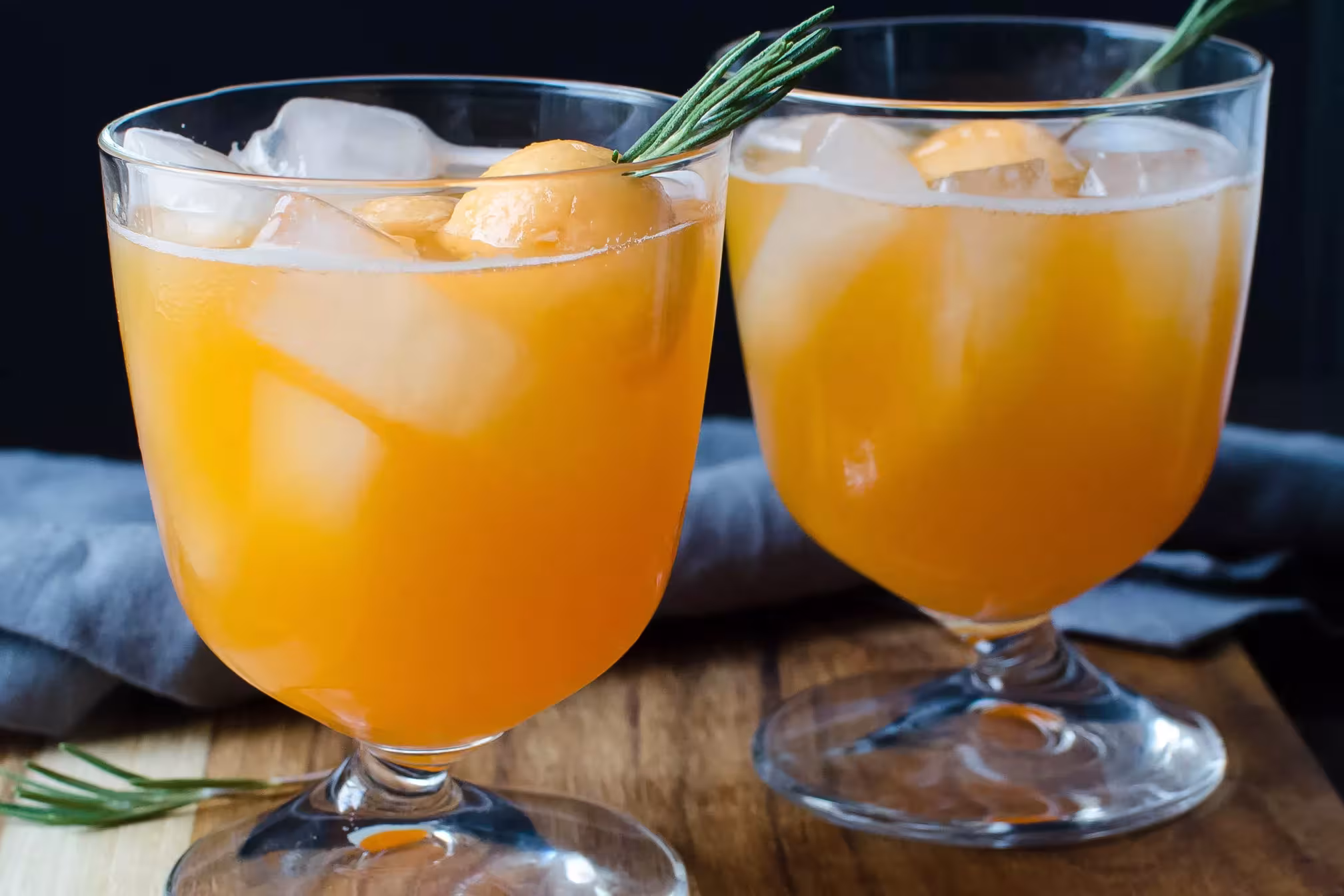 - Pour into a glass. Garnish with a fresh rosemary and balled cantaloupe.