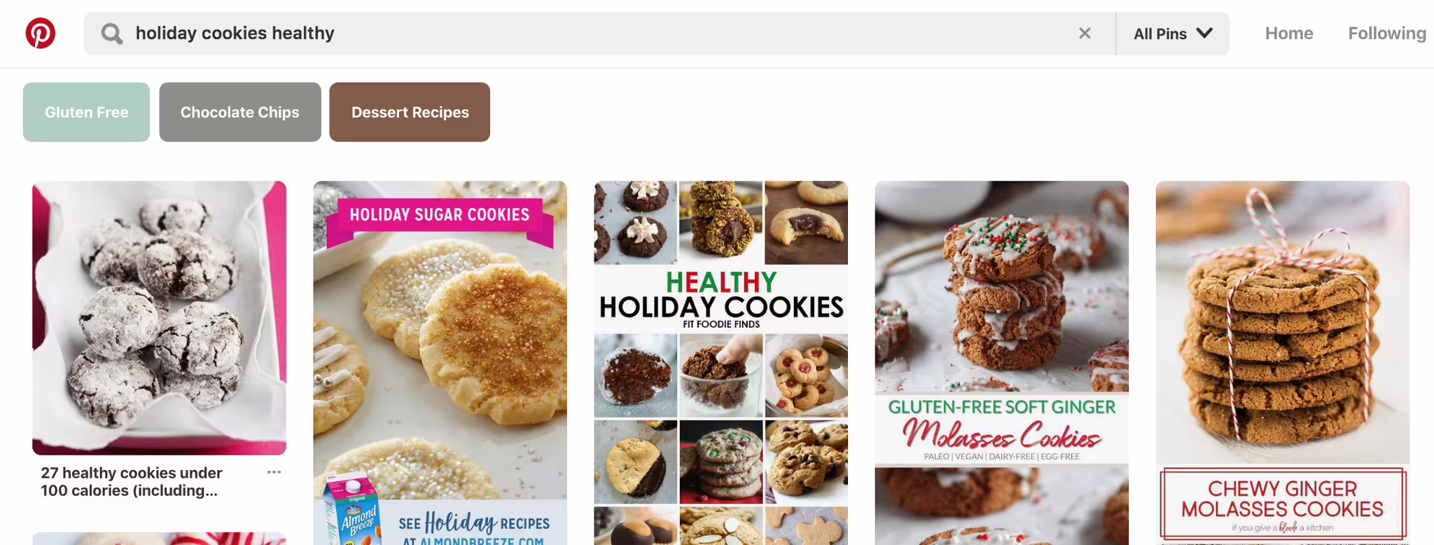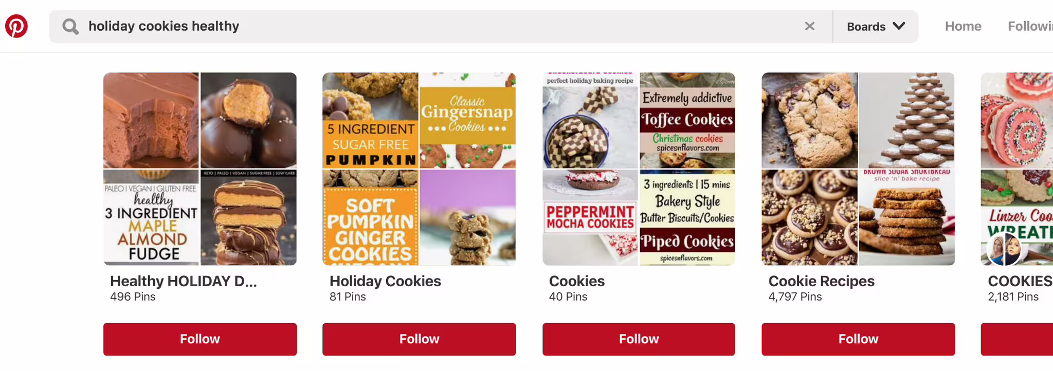 In light of the holidays let’s see what happens when we type “Holiday Cookies” into Pinterest’s search feature. After honing in on ‘Healthy’ and by boards, we are able to see how consumers are acting with this type of search.