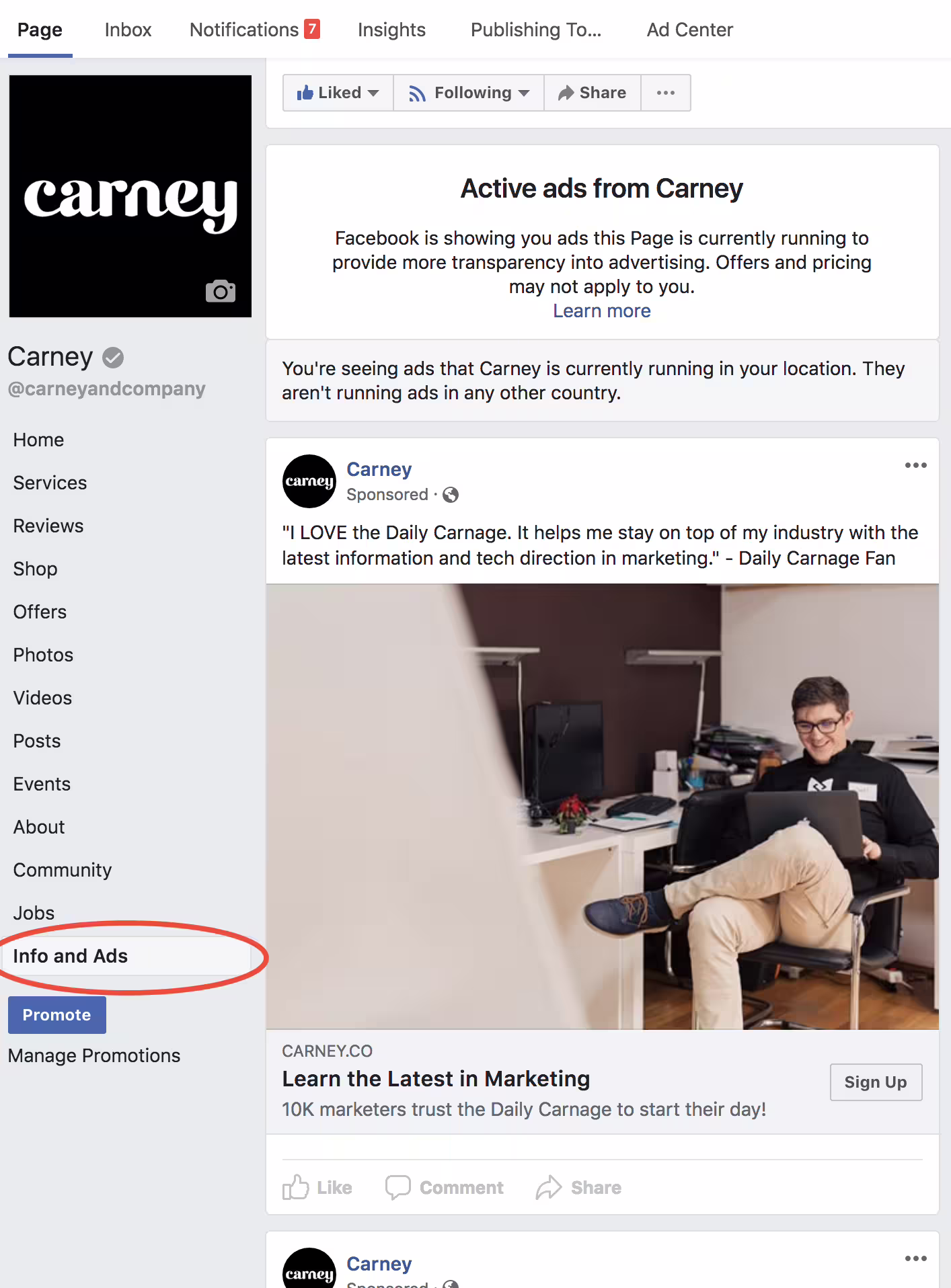 One really cool way to see how your competition is using Facebook Ads is utilizing the Info and Ads tool. It’s just another way Facebook is keeping things transparent. Simply, go to your competitor’s page, click Info and Ads in the left-hand navigation bar and bam! Here’s an example from our Facebook page.