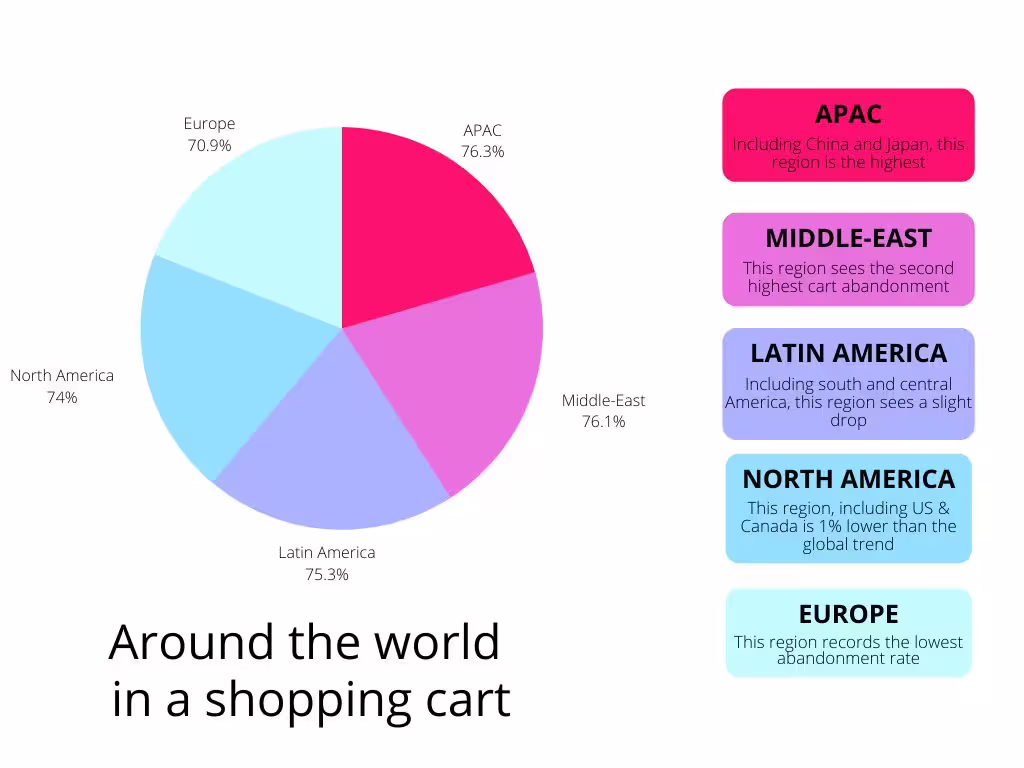 Travel, gadgets, and fashion industries see the most cart abandonment around the world. On average, the estimated abandonment rate is 75.2% and in most of the regions, the rate is around this number with minor differences.