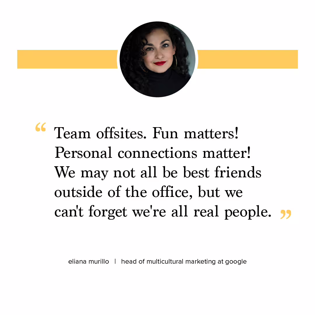 Team offsites. Fun matters! Personal connections matter! We may not all be best friends outside of the office, but we can’t forget we’re all real people. When you forget the humanity on your team, then you have problems. We also make sure we have a group chat for silly memes and pump up jams to keep everyone feeling positive and hyped!”