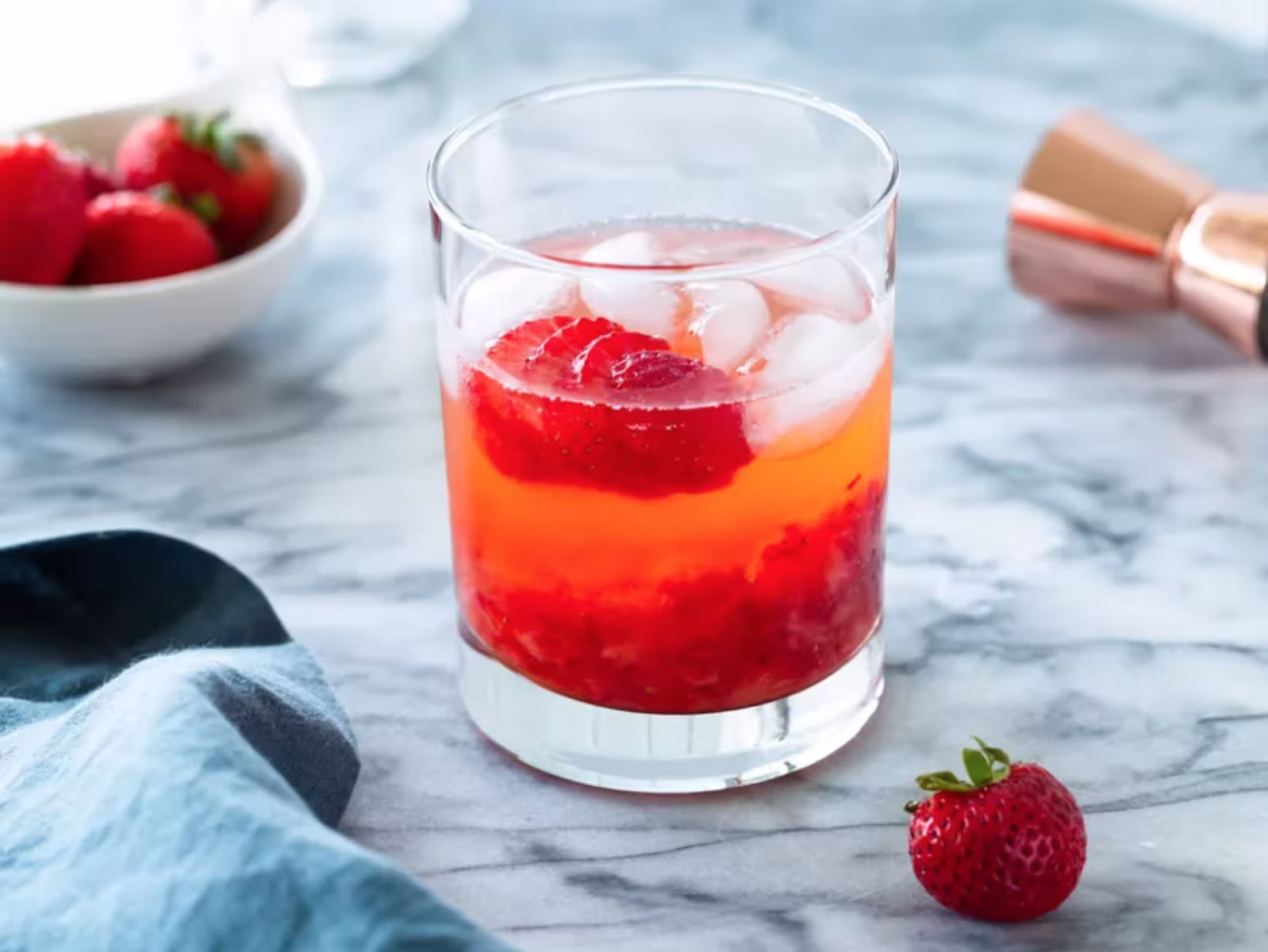 - Muddle the strawberries in the bottom of a tumbler or old-fashioned glass.