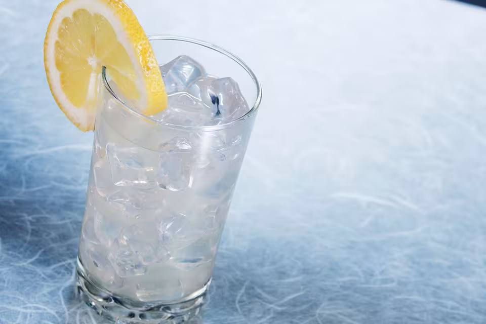 - Squeeze the juice of half a lemon into a collins glass, add lavender syrup and gin