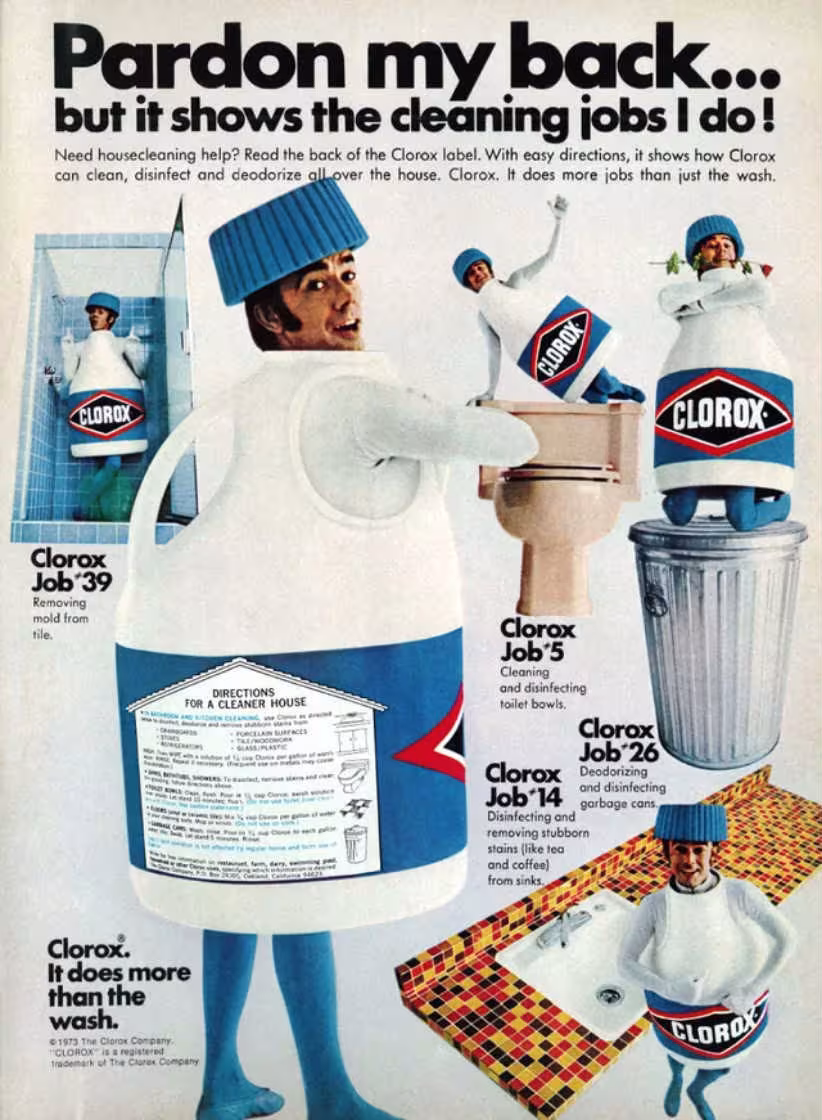 Anyone else getting Family Circus vibes from this ad from 1973? Well, we’re impressed with it. Clorox decided to illustrate all of its uses in a goofy way.