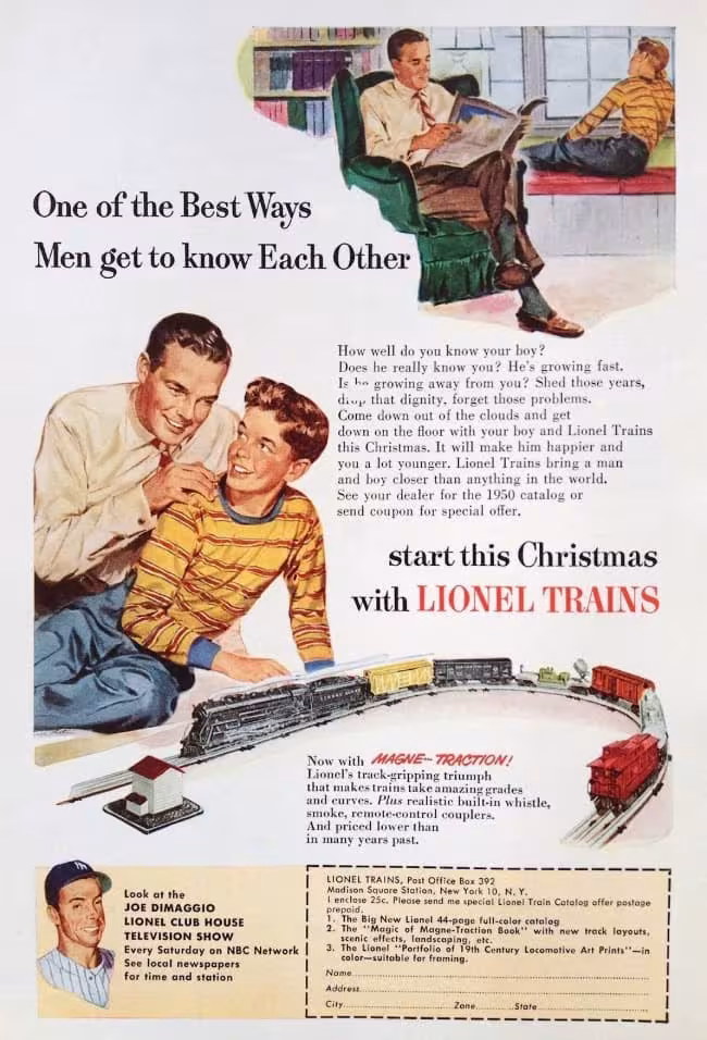 Lionel Trains dropped this one in 1950, and we truly think the copy is on point. They focus on the relationship between a father and son, rather than the product. That’s why it works so well!