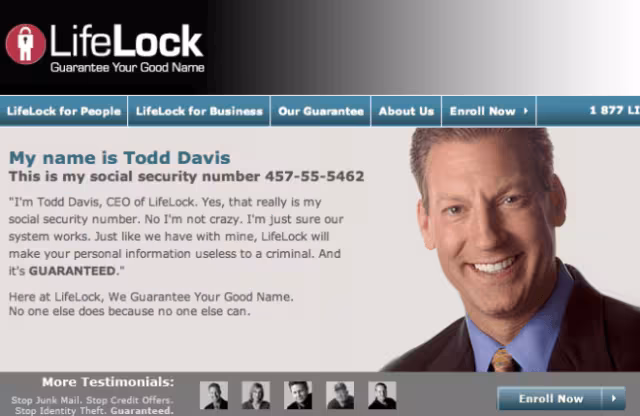 LifeLock ran this on their website many moons ago. Some folks took it as a personal challenge to steal Todd’s identity. Unfortunately for Todd, they succeeded. Don’t share your social security number folks!