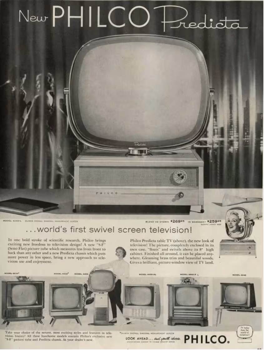 Philco launched this 1958 ad showcasing the first swivel screen tv. They sold it for around $260-ish. In today’s dollars, that’s well over $2K.