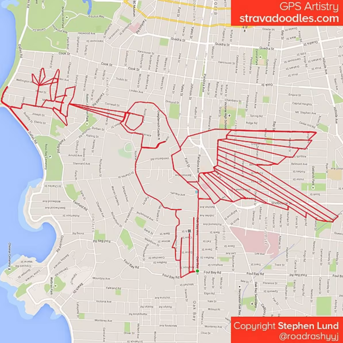 He is a Canada-based brand strategist + creative director for his day job, but a GPS artist the rest of the time. Using his bike journeys tracked by GPS, he makes fun map drawings. He’s also done hashtags for awareness campaigns and event messages. Our personal favorite:
