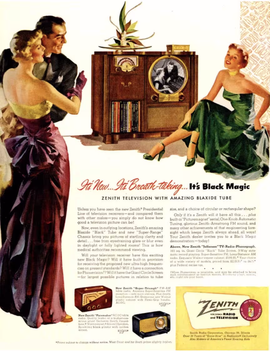 Could you imagine if circle-displayed televisions caught on? This ad from Zenith came out in 1950 to showcase its “Presidential Line” of TVs.