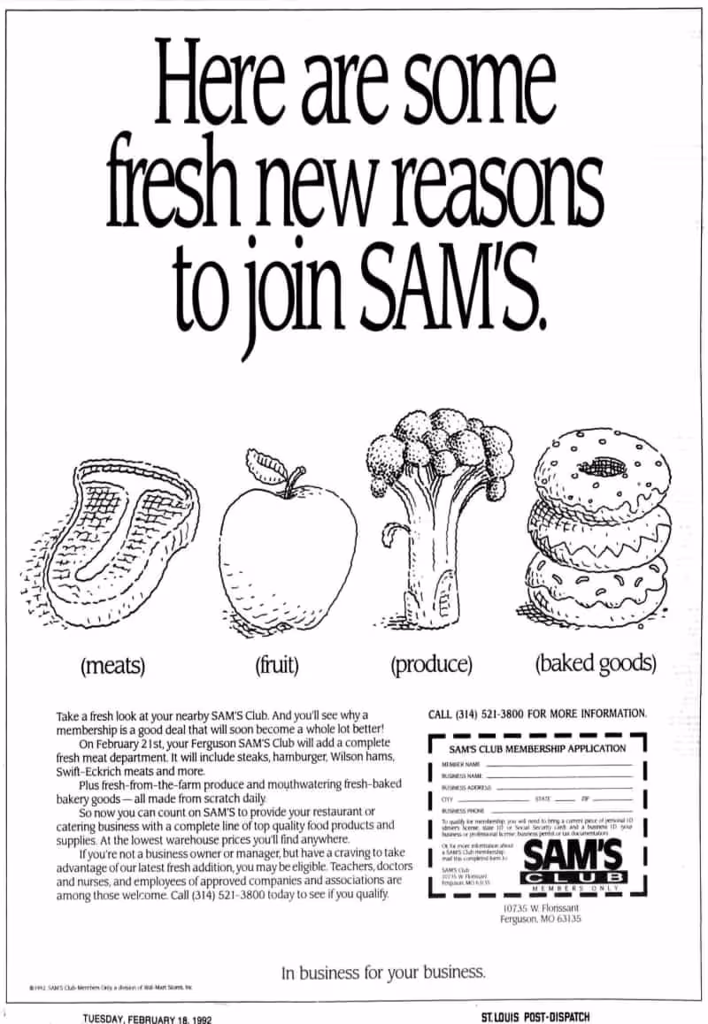 We don’t always join Sam’s Club, but when we do it’s because of fresh meats, fruit, produce, and baked goods! Ad from 1991.