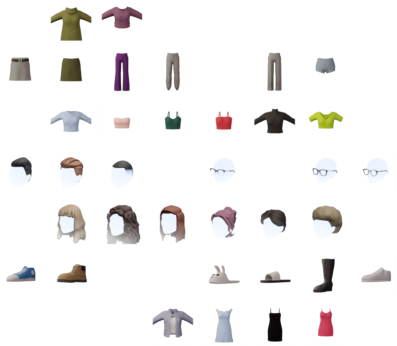 The editor enables users to update their avatar. Hair, clothing, and all asset colors are fully editable.